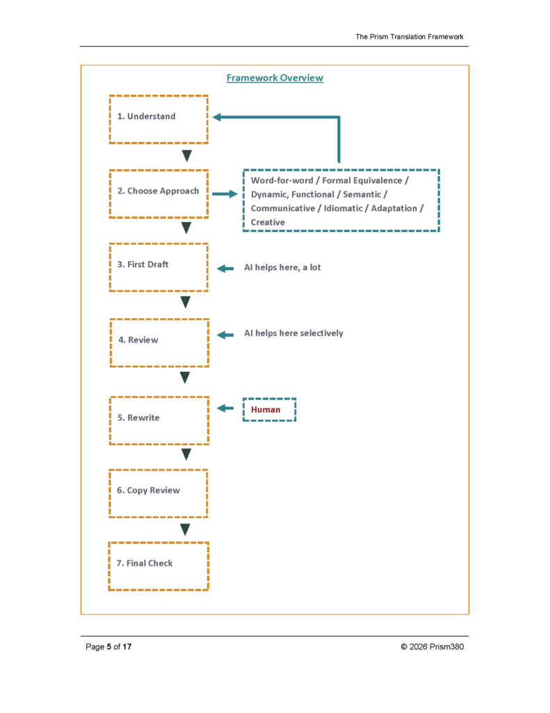 It is a practical framework designed for solo translators, small teams, and anyone managing a translation project under real-world constraints. It combines approach selection with a clear translation process, helping translators decide not only how to translate, but also how to manage the work from start to finish.